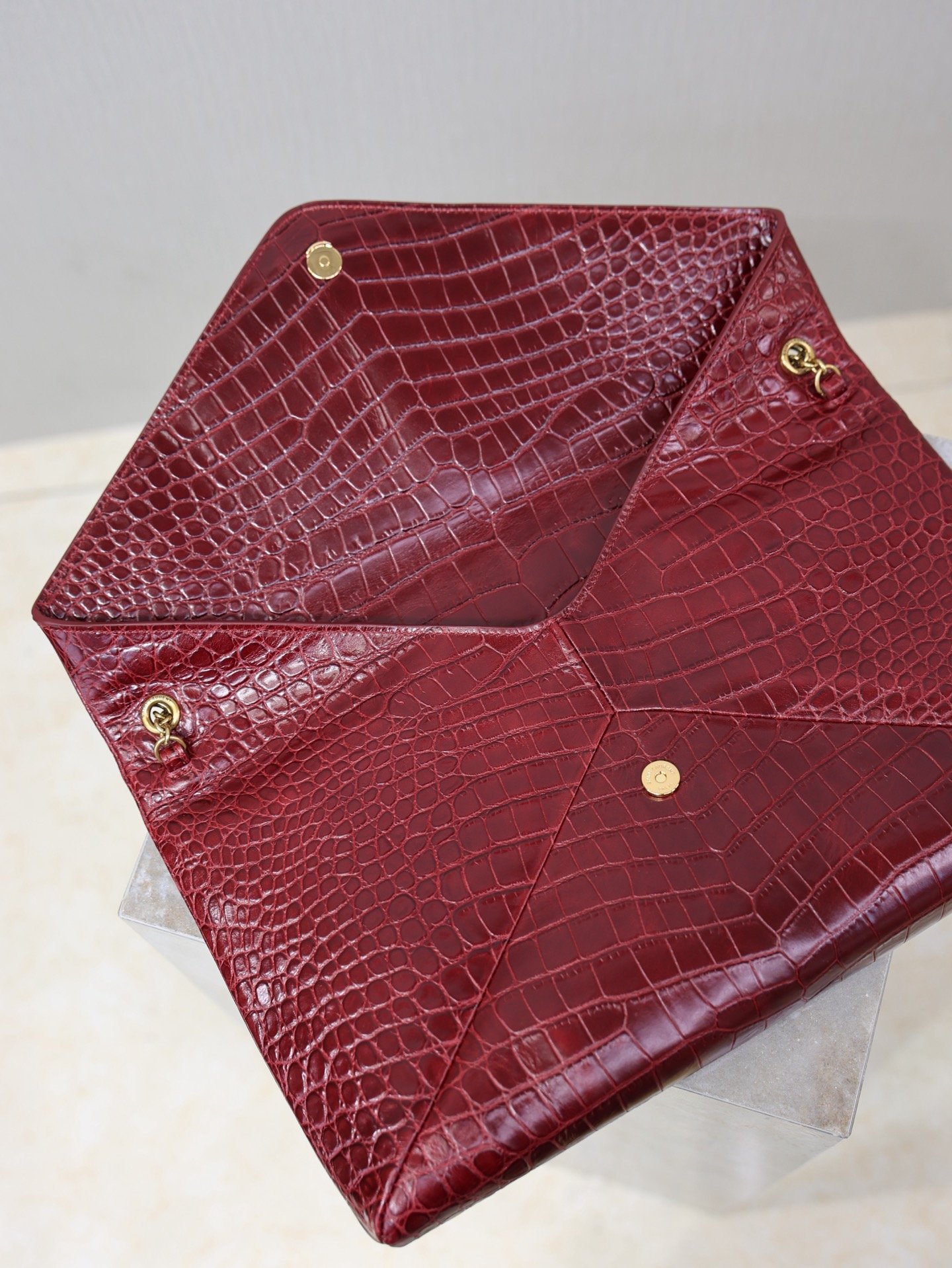 Saint Laurent’s wine-red crocodile-patterned envelope bag B6031203