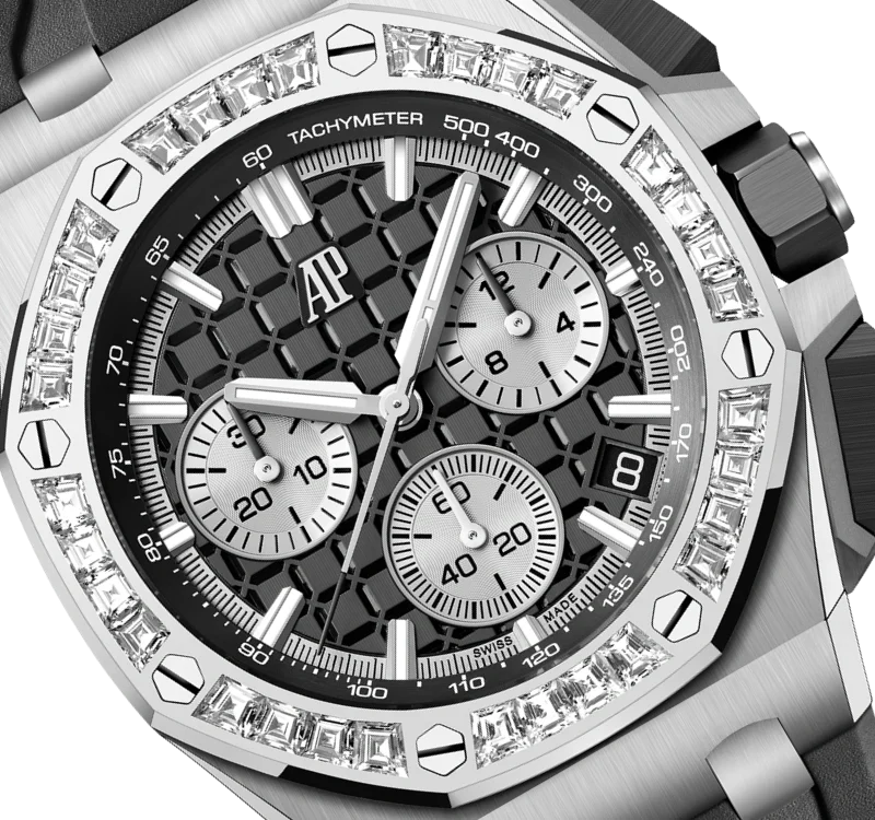 Black dial with ??M??ga Tapisserie?? pattern, silver-toned counters, white gold applied hour-markers and Royal?Oak hands with luminescent coating, black inner bezel.