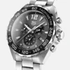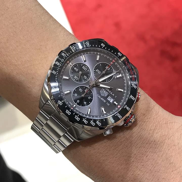 The sunray-brushed grey dial houses black azurage sub-dials at 6, 9 and 12 o??clock. The angled date window is at 3 o??clock.