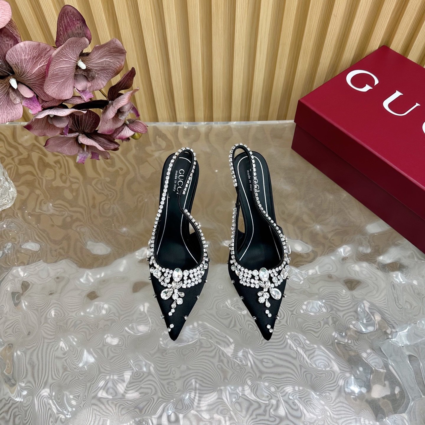 | Gucci crystal-decorated silk satin platform high heels | 5A Master quality | Size:35-42 | Shipping time:8-15 working days |