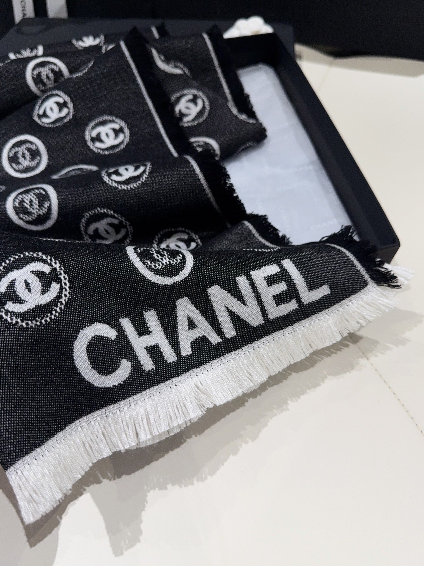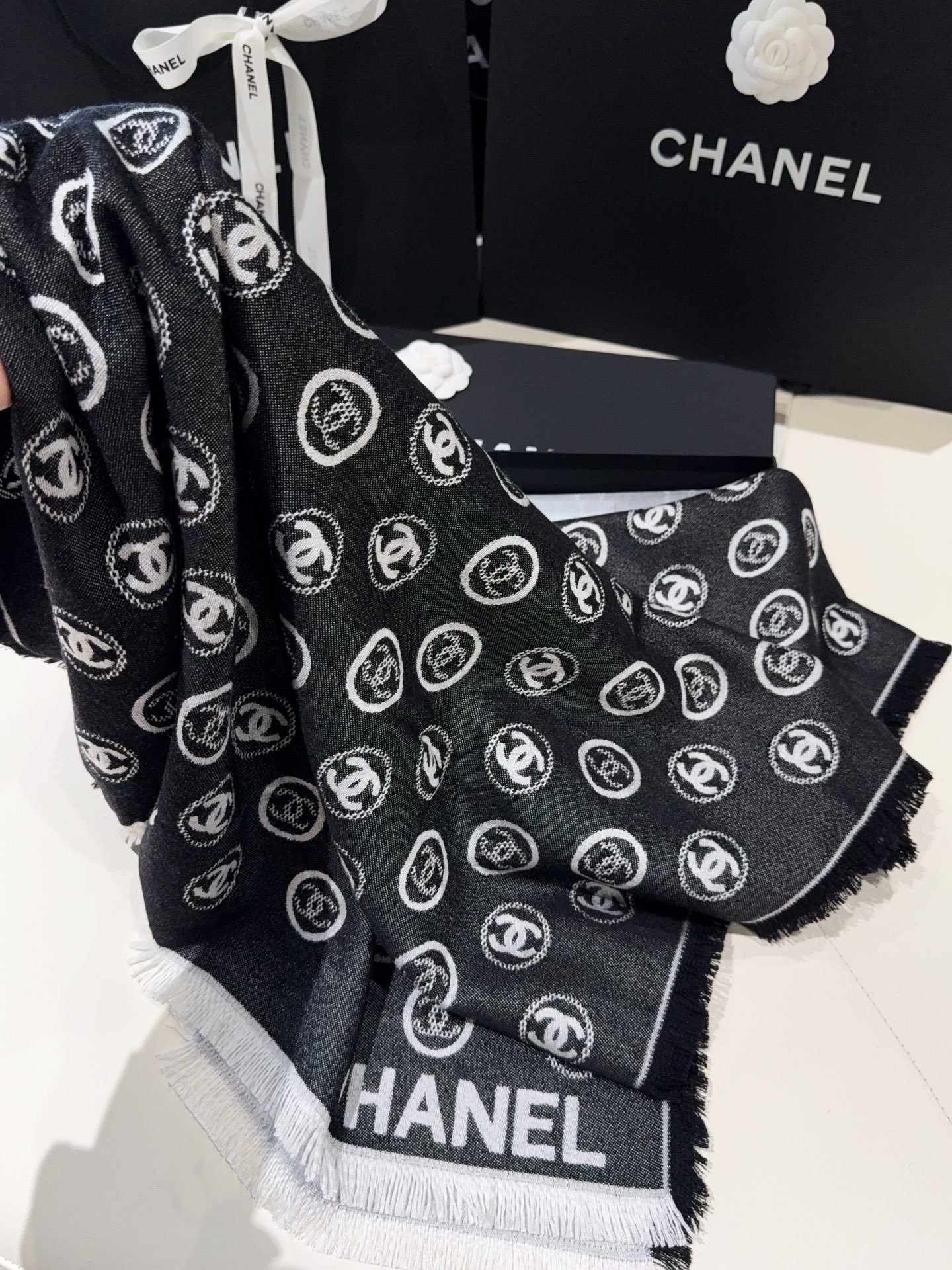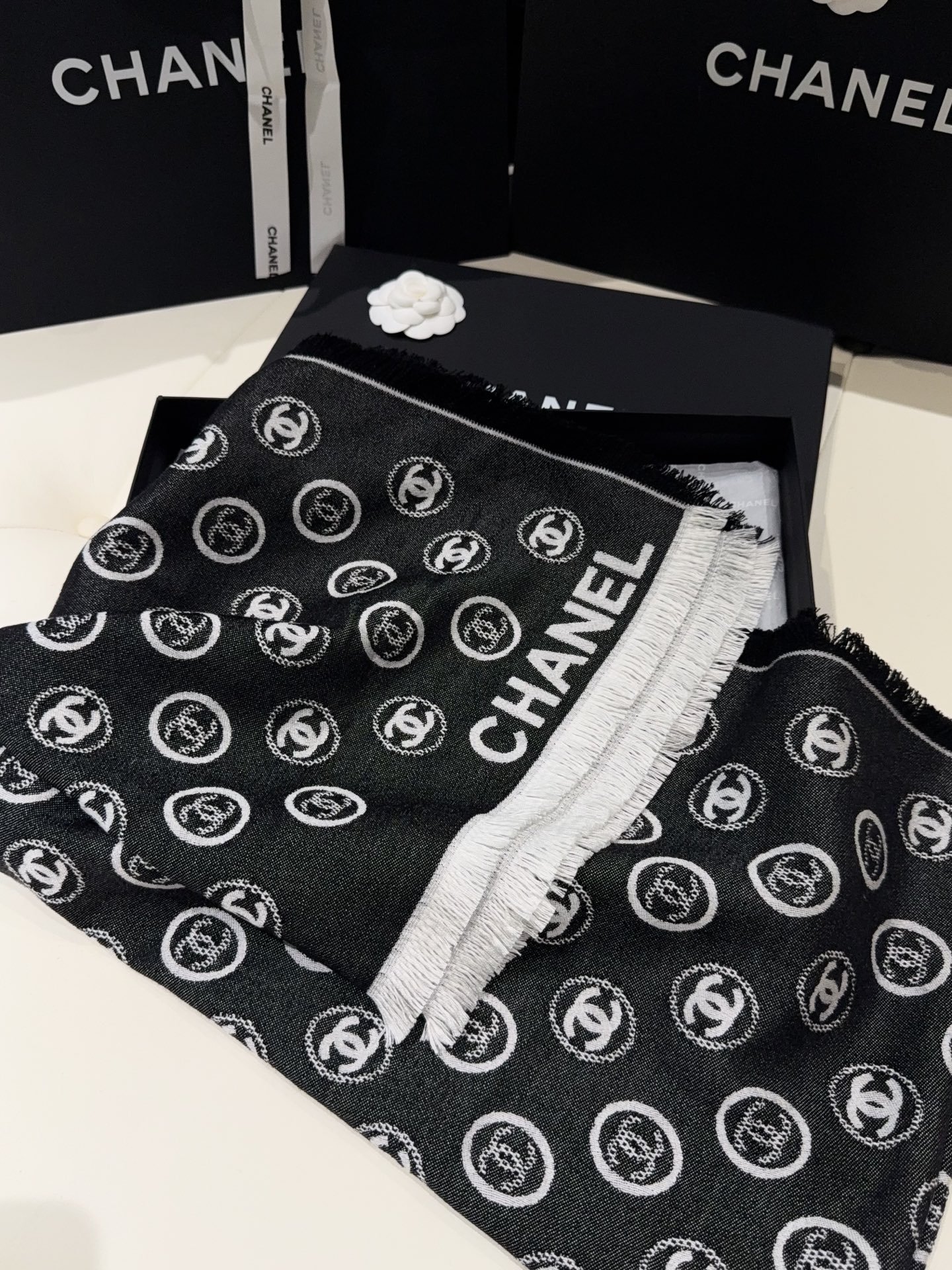 | Chanel Silk and cashmere blended yarn, 40-count machine-spun yarn, smooth and soft to the touch | Mirror quality | Size:70*164cm | Shipping time:7-18 days |