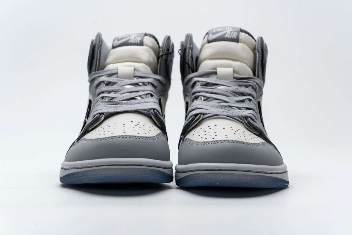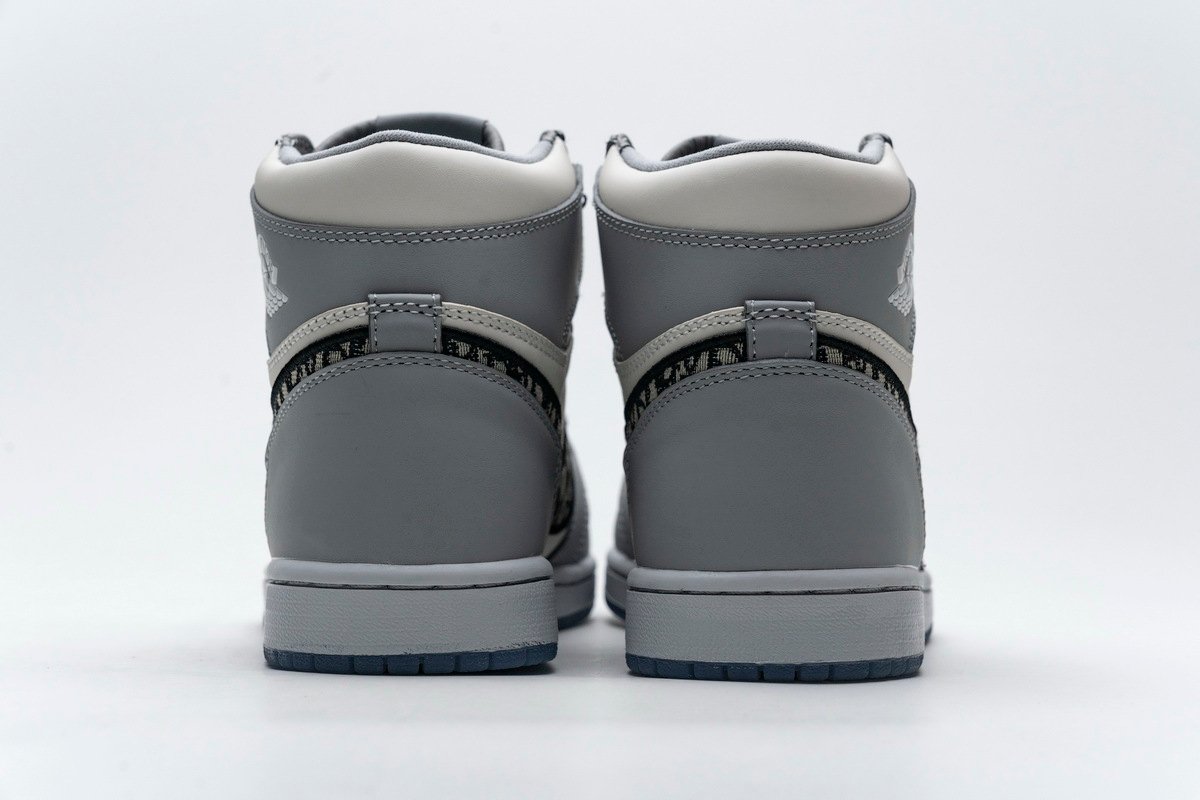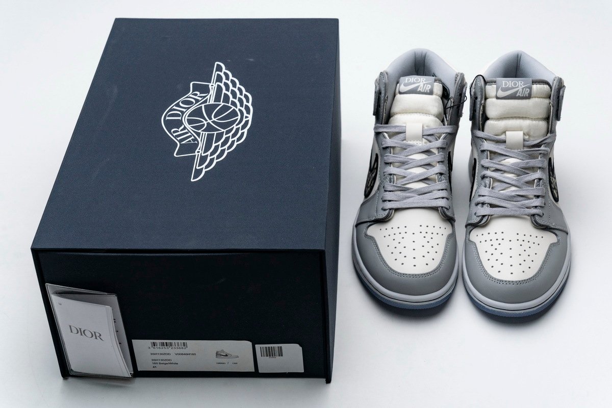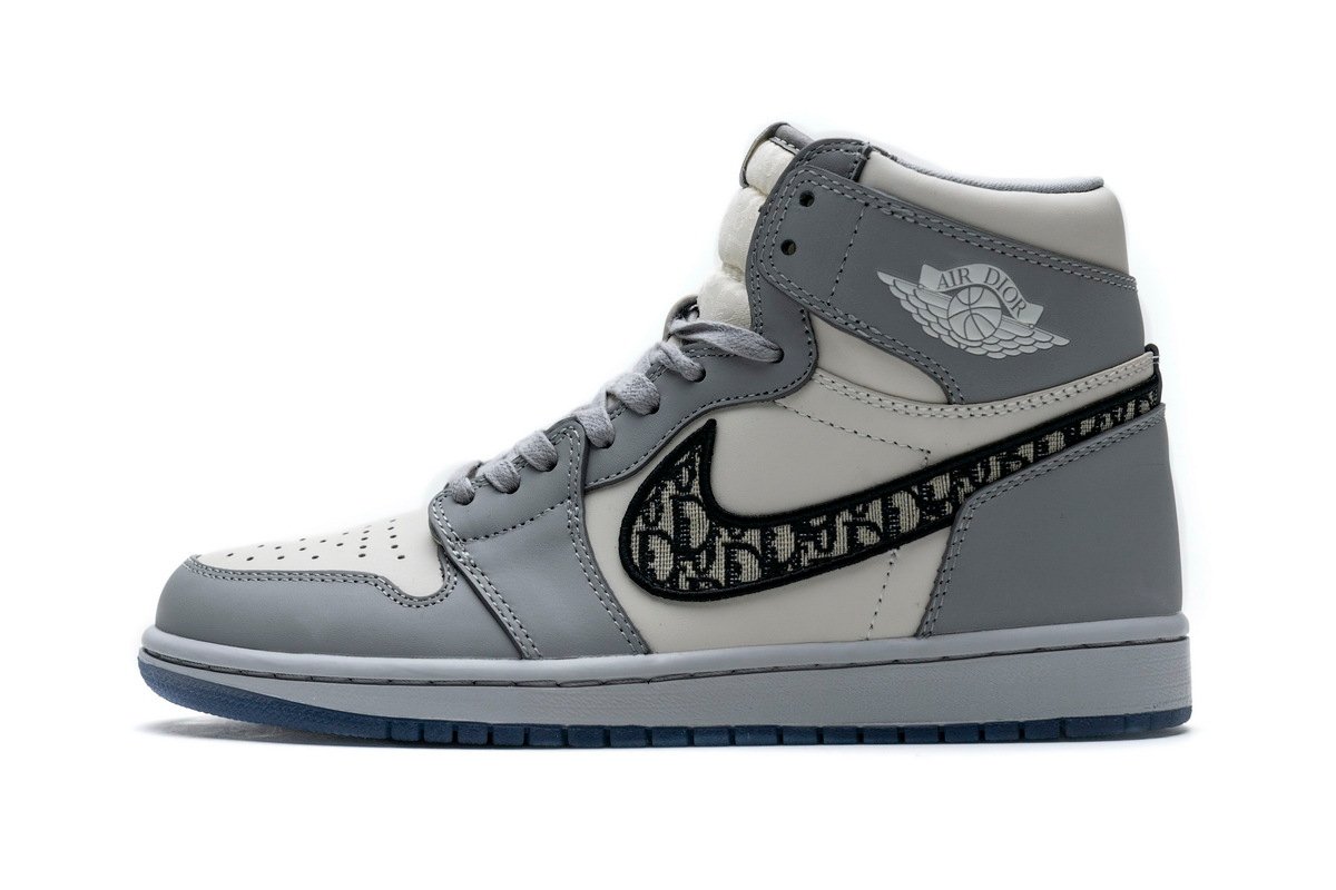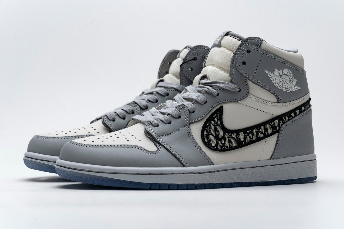 This Jordan 1 Retro High is composed of a white and grey leather upper with traditional Dior monogram print Swoosh. These shoes are made in Italy with premium materials. Co-branded icy translucent soles, Dior branded tongue and Wings logo, and a silver “Air Dior” hang tag completes the design.