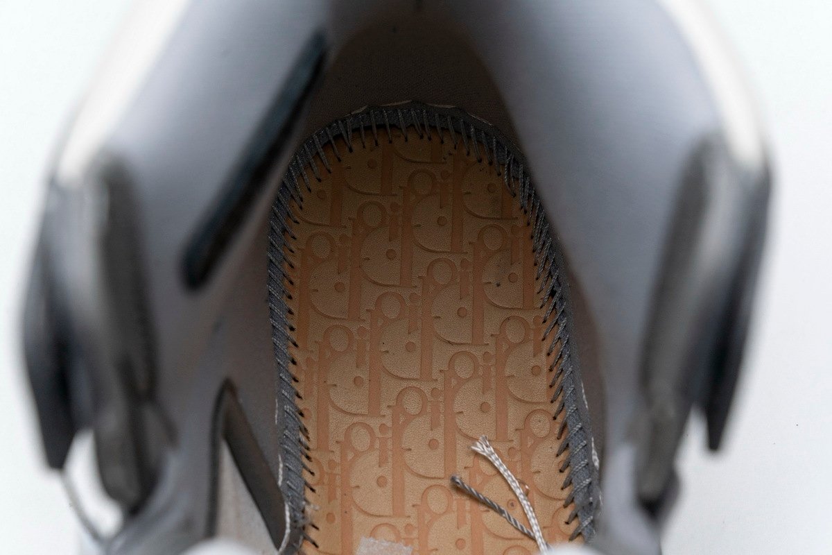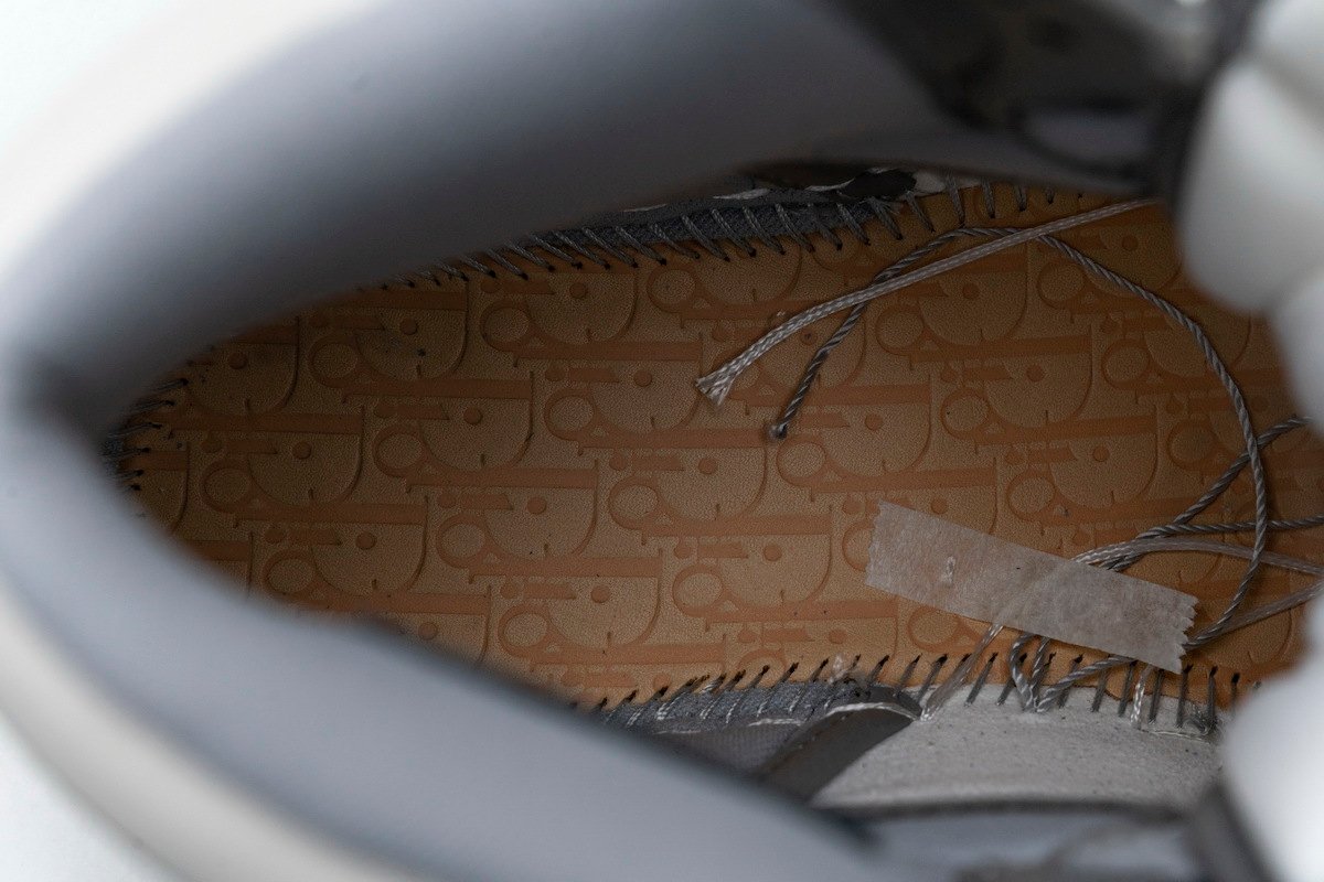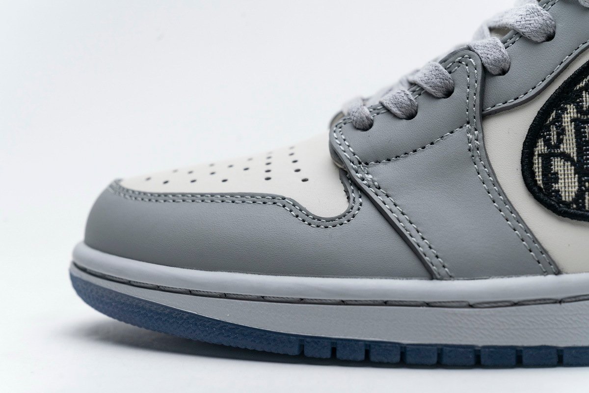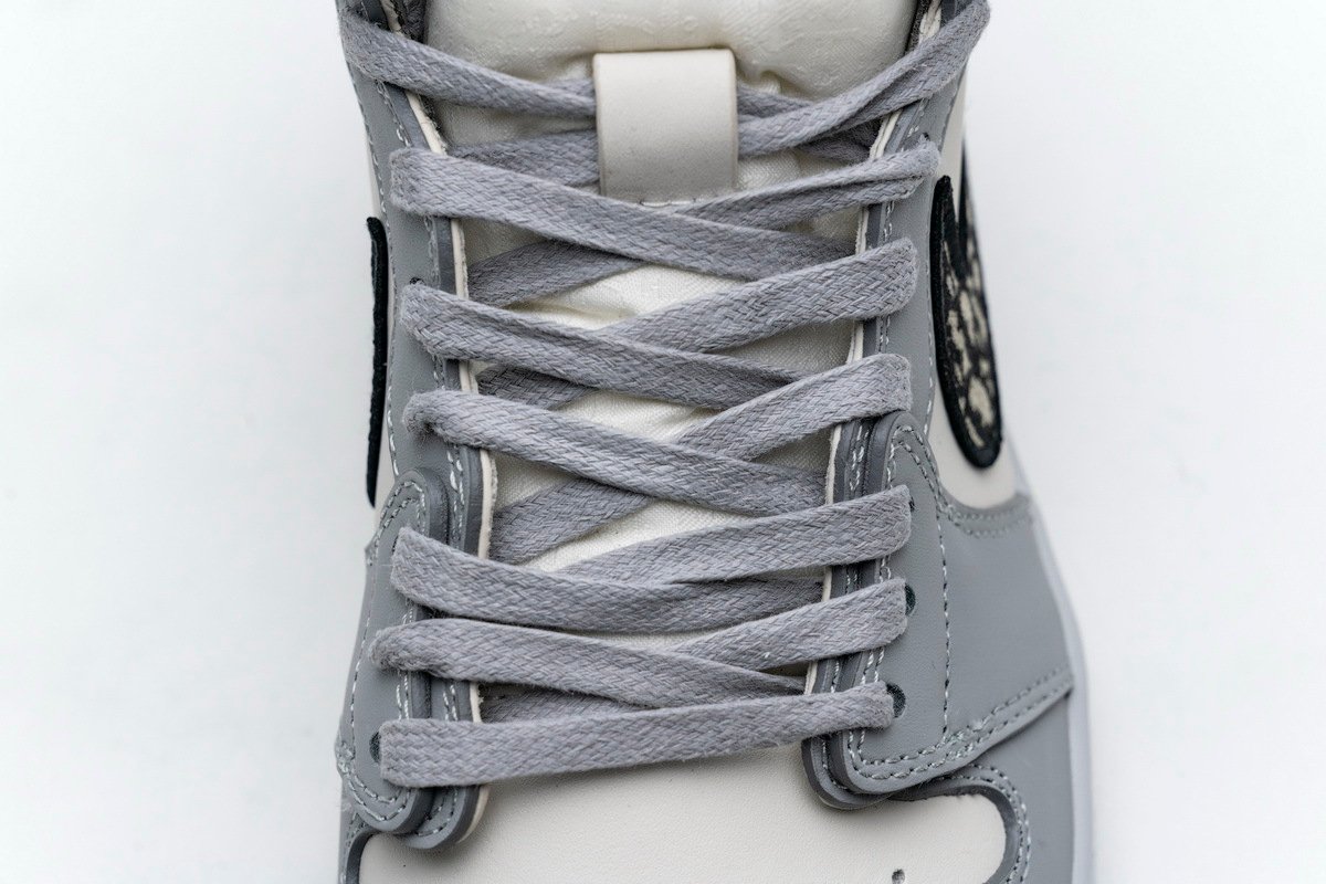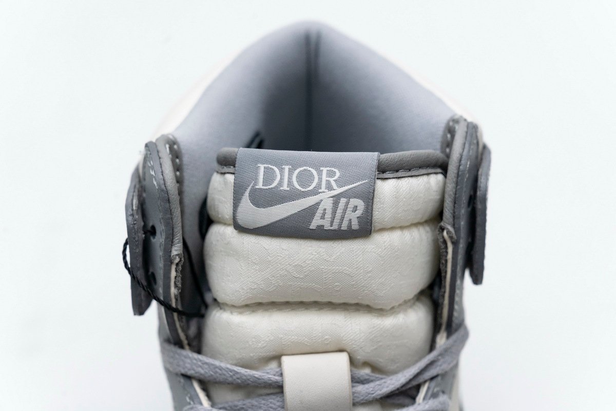 This Jordan 1 Retro High is composed of a white and grey leather upper with traditional Dior monogram print Swoosh. These shoes are made in Italy with premium materials. Co-branded icy translucent soles, Dior branded tongue and Wings logo, and a silver “Air Dior” hang tag completes the design.
