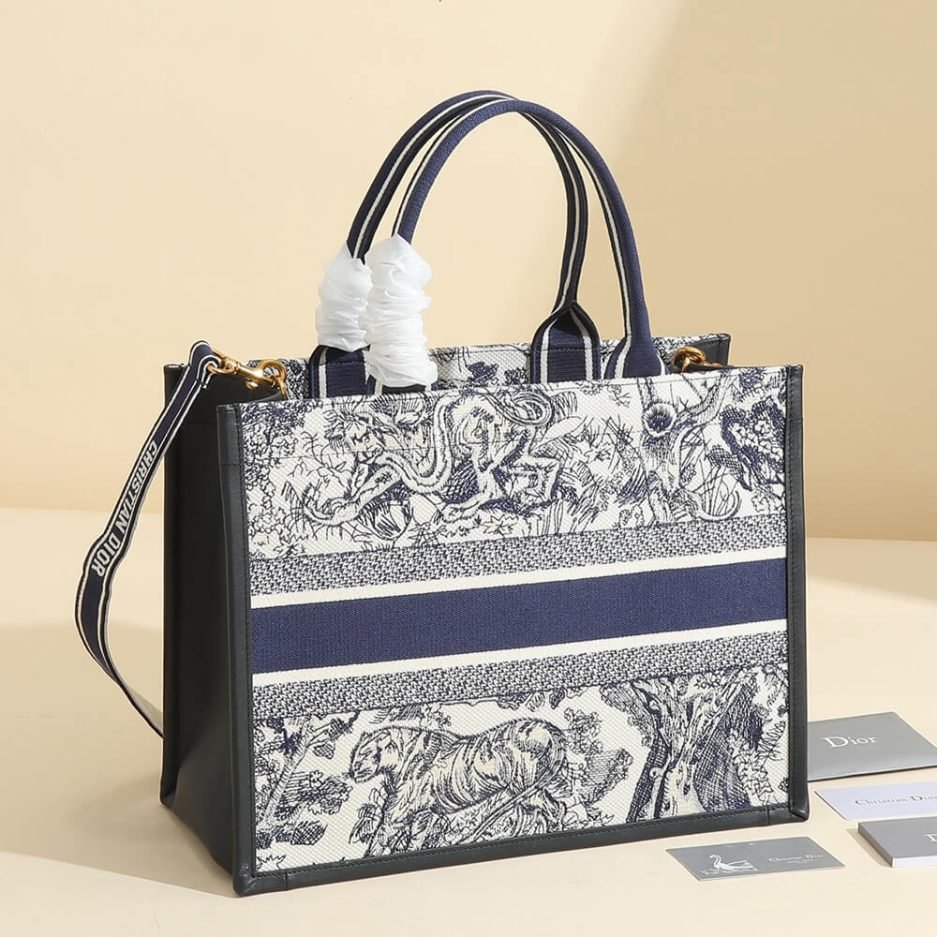 White and Navy Blue Toile de Jouy Sauvage Embroidery with Navy Blue Calfskin